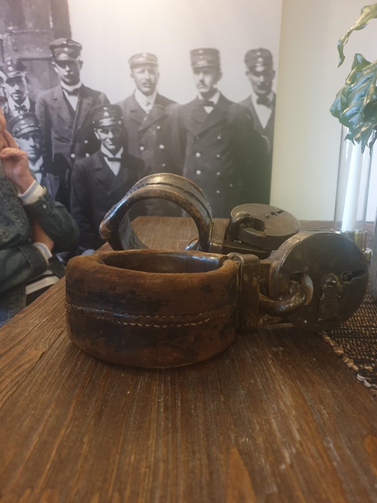 Vår guide Thomas inledde med att berätta om varför ett fängelse byggdes i Mariestad i mitten av 1800-talet och visade bland annat upp fotbojor som användes när fångar vistades utanför sina celler.